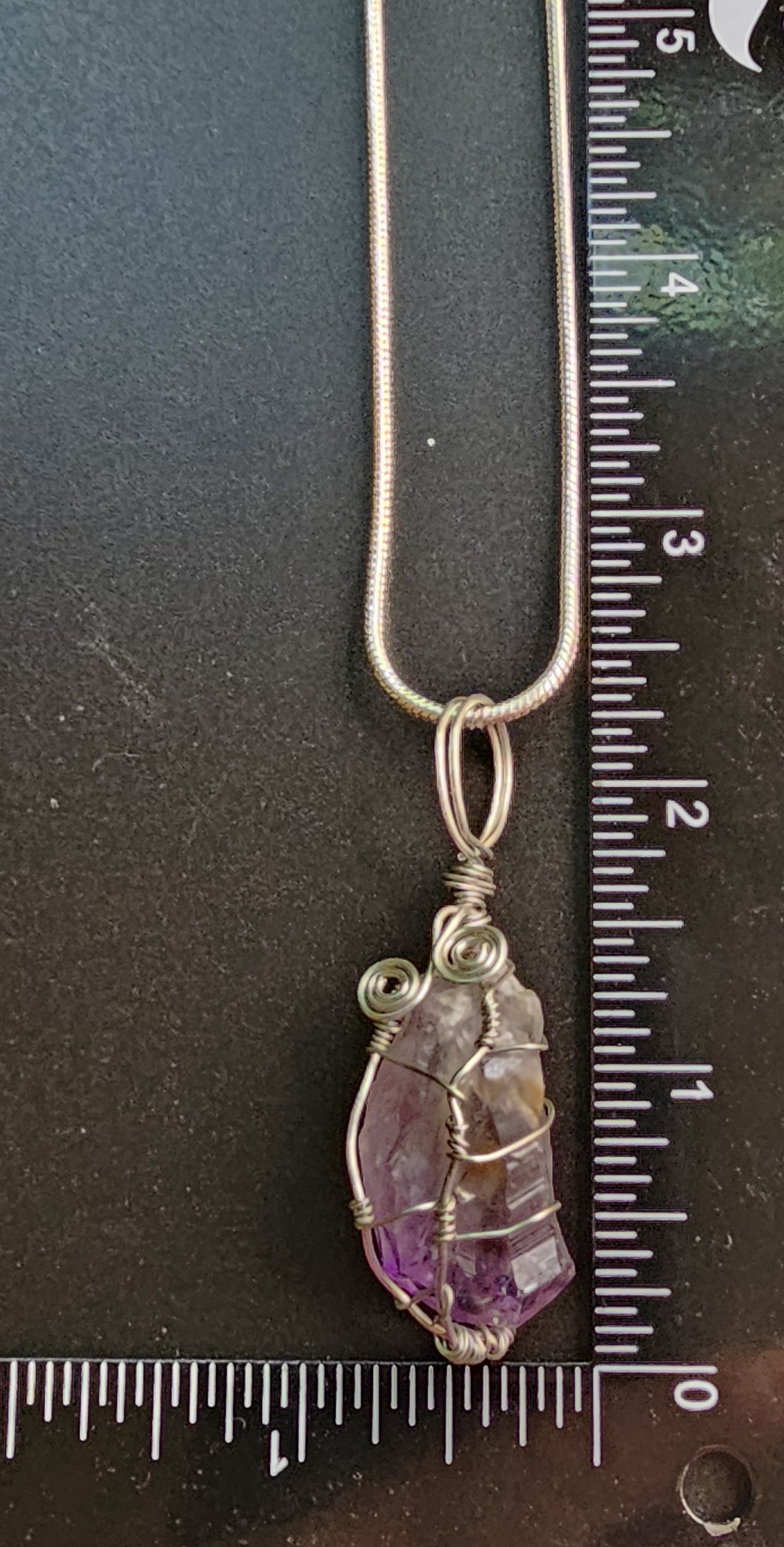 Shop › BCWR-4334-Amethyst Wire Wrapped Point-Necklace Image 1 of 3 Image 2 of 3 Image 3 of 3 BCWR-4334-Amethyst Wire Wrapped Point-Necklace $14.99 Silver chain with lobster claw clasp, approx. 20 inch length, pendant size approx. 0.75 inches x 1.50 inches. Add To Cart Added! Silver chain with lobster claw clasp, approx. 20 inch length, pendant size approx. 0.75 inches x 1.50 inches.